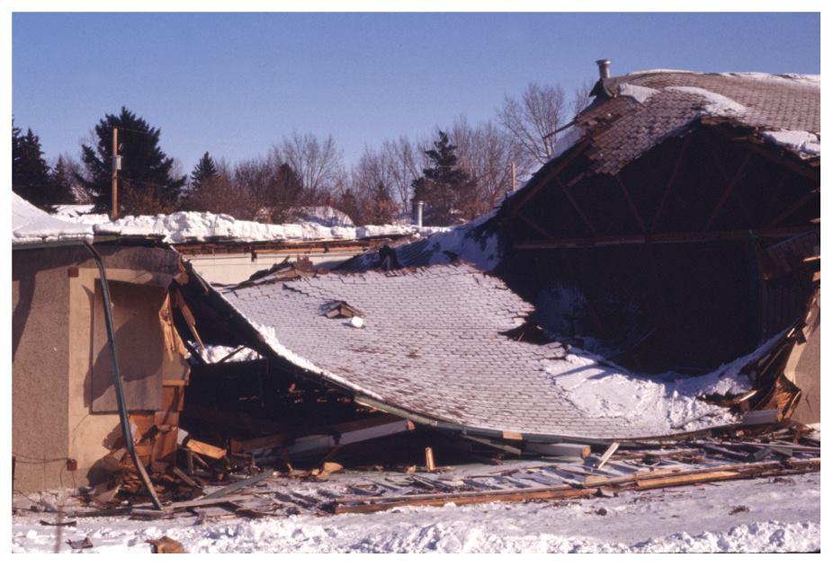 The roof of the curling and skating section of the club collapsed in March 1974. This image shows the aftermath of the roof collapse, which was caused by exceptionally heavy snow that winter.